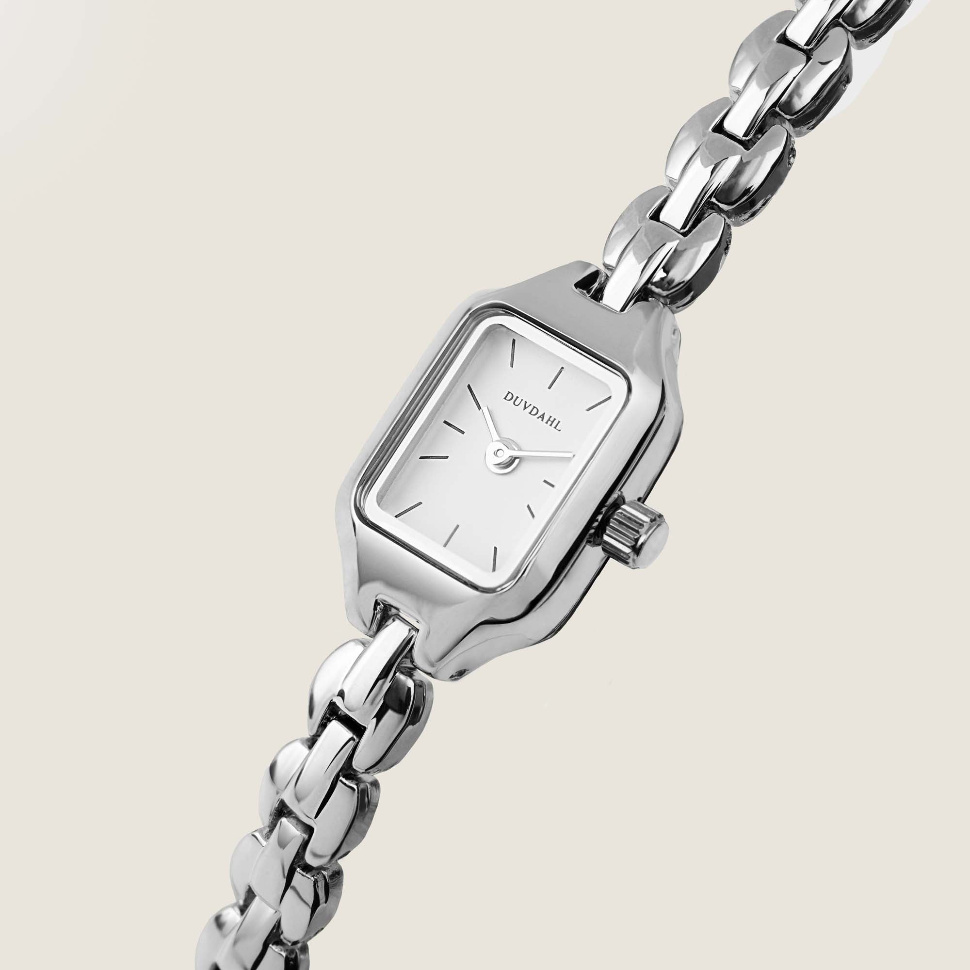 The Duvdahl watch features a sleek, minimalist design with a contemporary bracelet strap and a timeless dial in plated silver.