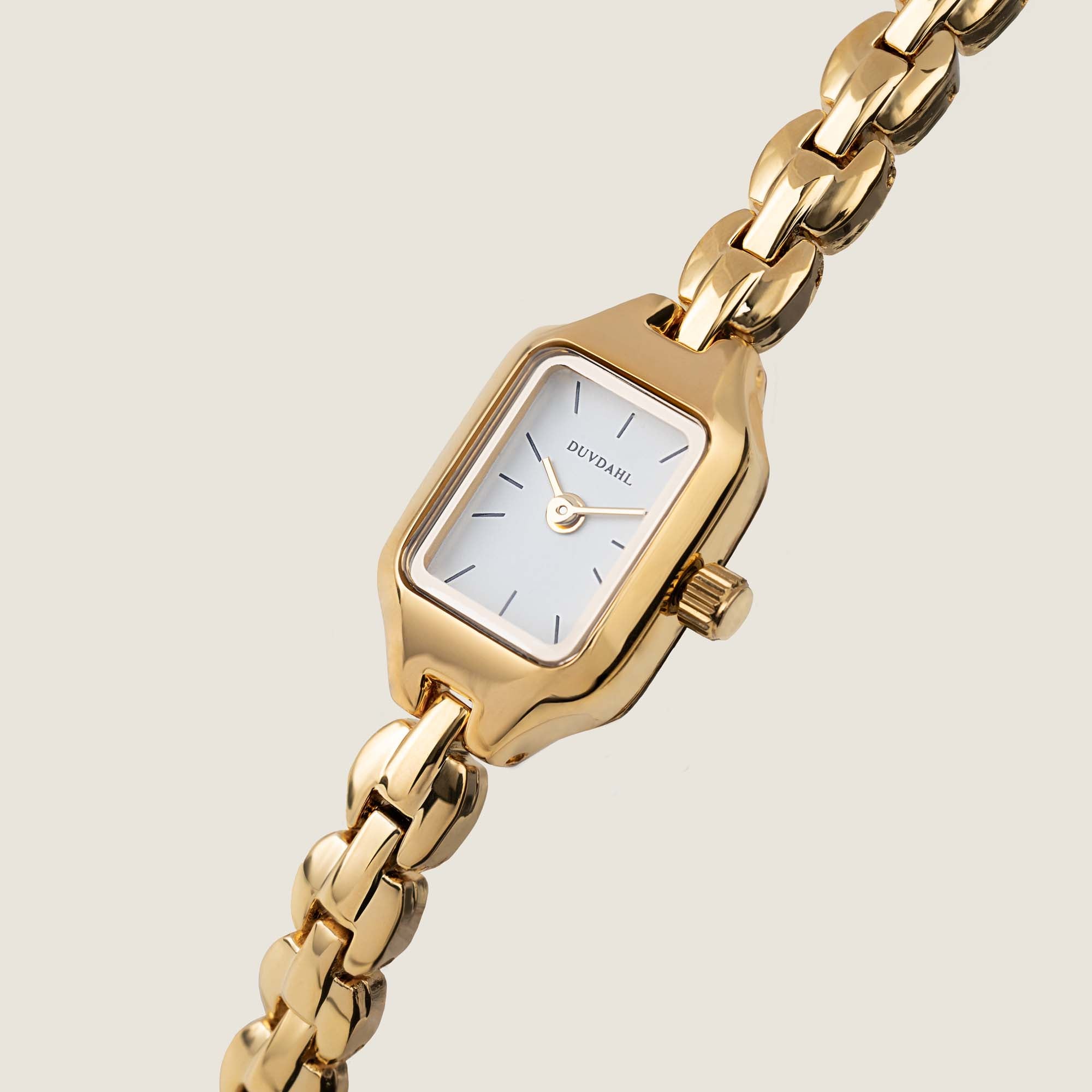 The Duvdahl watch features a sleek, minimalist design with a contemporary bracelet strap and a timeless dial in plated gold.
